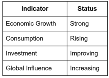 - Long-term trajectory still points toward becoming a top 3 economy