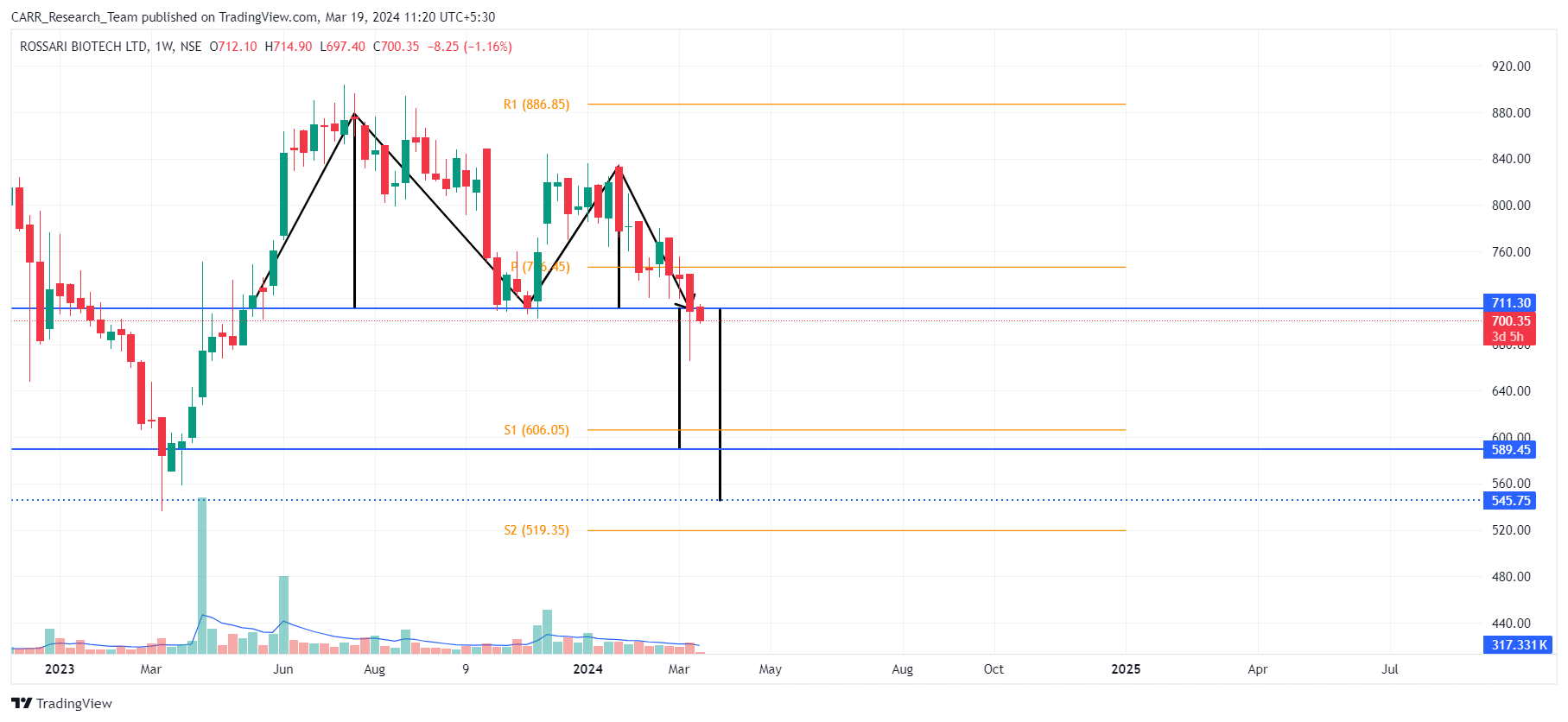 Since March 2023, the stock exhibited a significant upward trajectory. However, from May 2023 to March 2024, it formed a double top pattern on its weekly chart. March 2024 witnessed a breakout, backed by average trading volume. Presently, the stock's RSI indicates a low level. According to technical analysis, if the breakout momentum persists, the stock may experience further downward movement.
