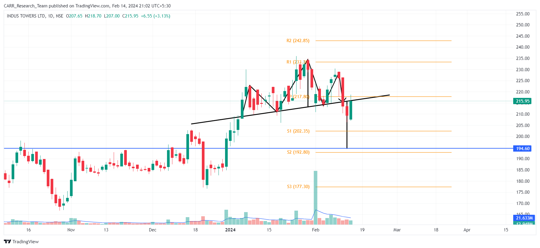 Since April 2023, the stock has experienced an upward trend. Between January and February 2024, a head and shoulder pattern emerged on its daily chart. The pattern witnessed a breakout on February 12, 2024, leading to an initial downward movement. Presently, the stock is undergoing a retest of the breakout levels. The Relative Strength Index (RSI) is currently below 50. According to technical analysis, the stock may see further downward movement if it regains the breakout momentum.