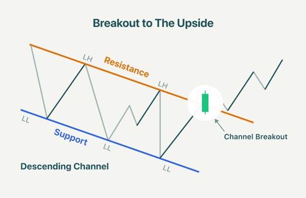 Breakout: A breakout occurs when the price closes convincingly above the upper channel line, showing a shift in sentiment from bearish to bullish.